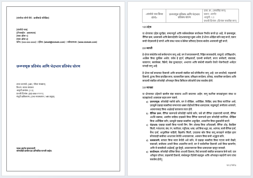 या टेम्पलेटमध्ये purpose, scope, definitions, policy statement, prohibited conduct, roles and responsibilities, reporting concerns, investigation and resolution, confidentiality, protection against retaliation, false allegations, training आणि policy review असे महत्त्वाचे भाग समाविष्ट करता येतात. त्यामुळे दस्तऐवज पूर्ण, संतुलित आणि व्यावहारिक वाटतो. तसेच तो generic internet format पेक्षा अधिक विश्वासार्ह दिसतो.