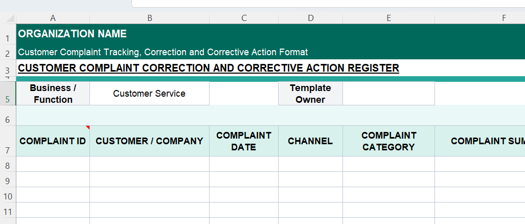 Customer Complaint Correction and Corrective Action Register Excel Template