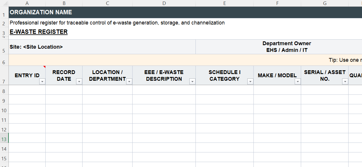 A professional E-Waste Register Excel Template for recording, tracking, and managing electronic waste entries with clarity and consistency. Includes usage info, empty format, sample entries, dropdown values, and a practical structure for offices, factories, schools, hospitals, and businesses.