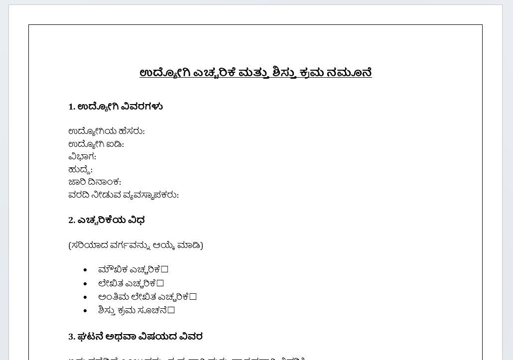 Employee Warning & Disciplinary Action Form Kannada Template
