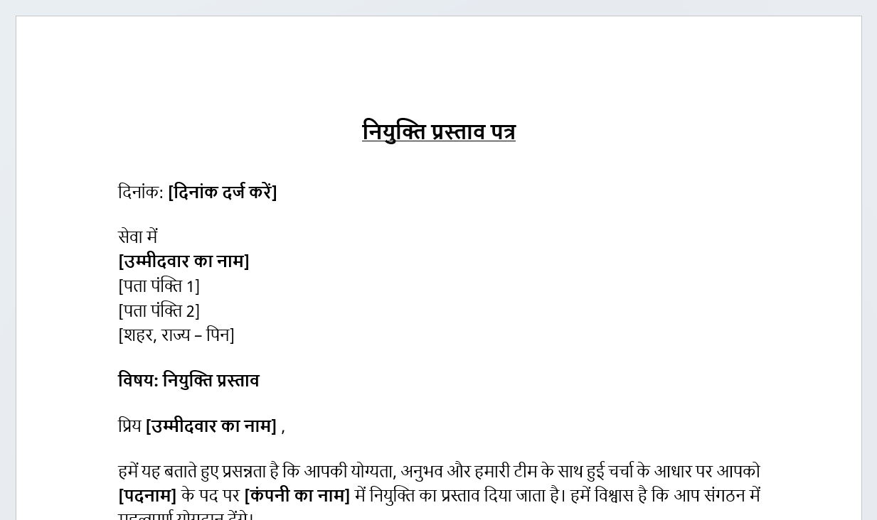 Hindi Employment Offer Letter Template