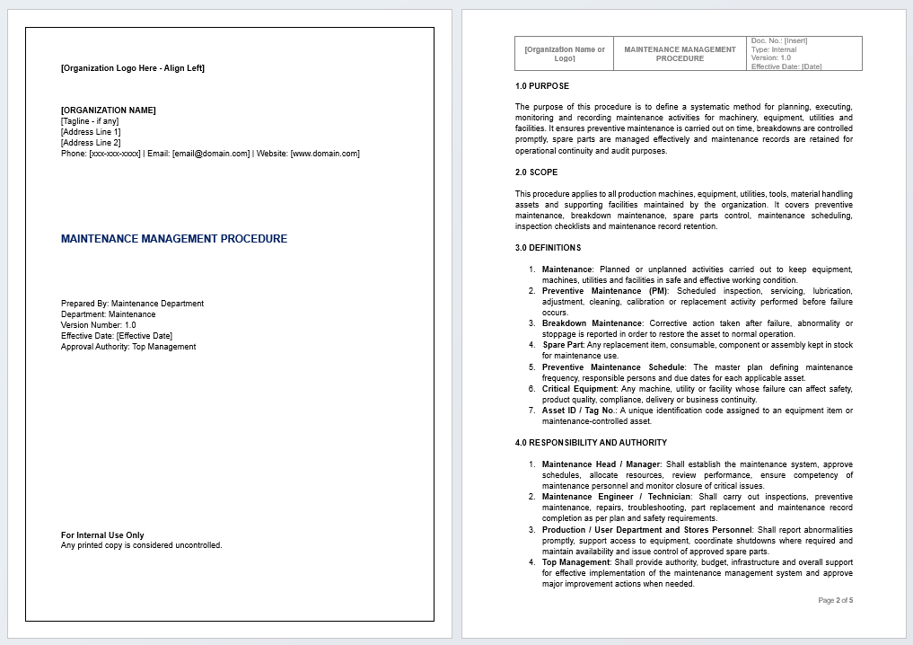 This Maintenance Management Procedure template can be used by maintenance managers, plant engineers, facility managers, factory heads, EHS professionals, quality teams, administration departments, consultants, and business owners. It is also suitable for startups, SMEs, manufacturing companies, warehouses, workshops, commercial buildings, institutions, and service organizations.