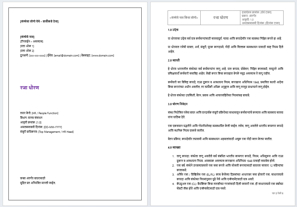 ही मराठी रजा धोरण टेम्पलेट संस्थेतील रजेचे नियम स्पष्ट, व्यावसायिक आणि वापरण्यास सोपे पद्धतीने मांडते. यात उद्देश, व्याप्ती, धोरण जाहीरनामा, व्याख्या, भूमिका, मंजुरी प्रक्रिया, दस्तऐवज आवश्यकता, रजा शिल्लक, कॅरी फॉरवर्ड, एन्कॅशमेंट, अर्धा दिवस रजा, सुट्ट्या, नोंदवही नियंत्रण आणि अनुपालन अशा महत्त्वाच्या बाबी समाविष्ट आहेत. त्यामुळे संस्था एकसमान leave administration system तयार करू शकते. शिवाय ही पॉलिसी HR टीमला policy standardization मध्ये मदत करते.