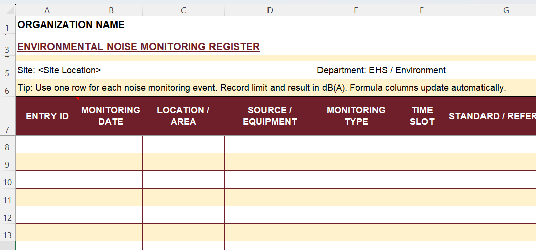 It is especially useful for organizations that need a professional noise monitoring log, sound level register, environmental noise monitoring sheet, boundary noise record, ambient noise log, or EHS monitoring template in Excel. In addition, businesses implementing environmental management systems or EHS controls can use it as part of documented monitoring evidence. Hence, it suits both small businesses and large multi-site organizations.