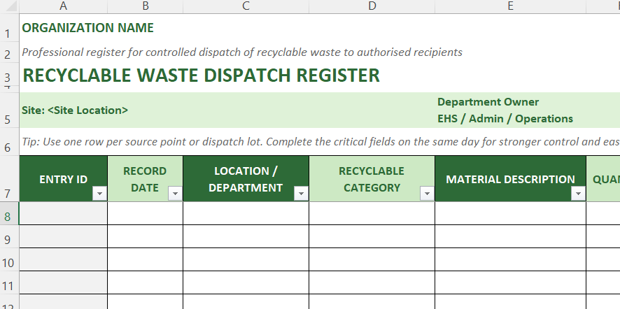 If your site needs a recyclable waste dispatch record, scrap dispatch register, dry waste dispatch log, recycler handover register, or waste dispatch Excel template, this product directly addresses that requirement. It gives users a ready-to-use structure instead of forcing them to design their own format.