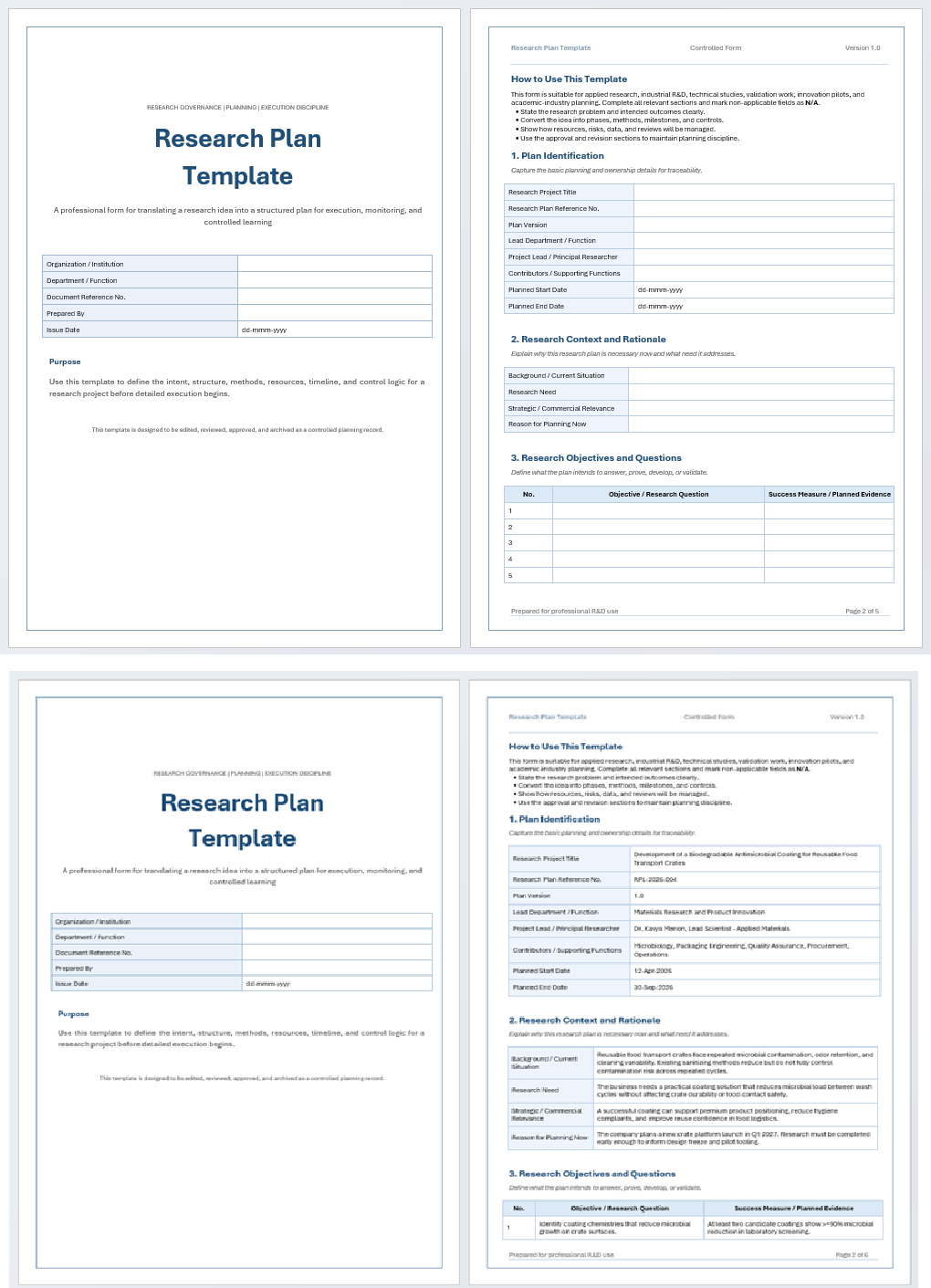 This research plan template is useful for R&D teams, researchers, scientists, engineers, consultants, innovation managers, startup founders, product development teams, academic staff, students, and technical project leaders. Likewise, it is suitable for organizations that want a standard format for planning research-related work across departments.