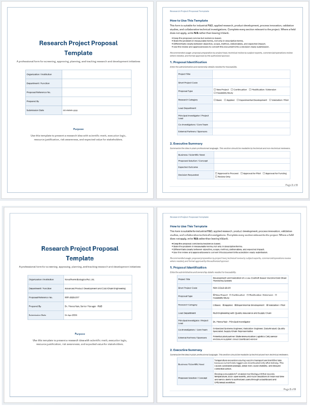 This editable Word template is useful for research planning, applied research, product development, validation studies, innovation projects, technical feasibility studies, and internal R&D approvals. In addition, it supports organizations that want better proposal quality before spending time, people, and money on research work. As a result, users can define the project need, project objective, scope, method, expected outcomes, risks, budget, and approvals in one place.