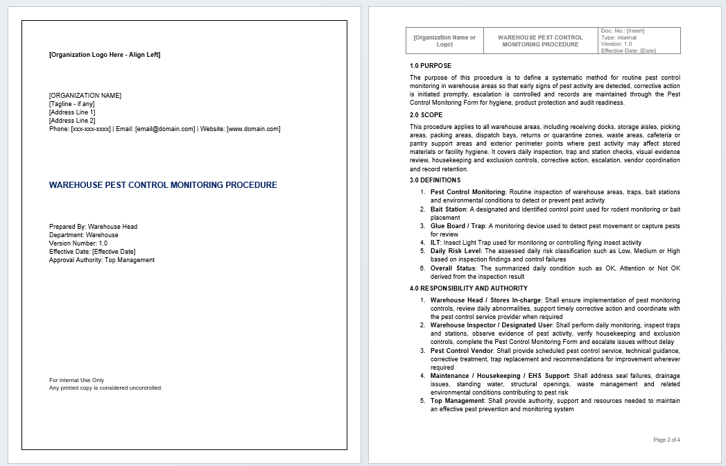 This Warehouse Pest Control Monitoring Procedure Template helps organizations standardize pest monitoring activities in warehouse and storage areas. Moreover, it defines responsibilities, monitoring steps, record control, and follow-up actions. It is useful for warehouses, factories, logistics operations, facility teams, and quality-driven businesses that need better hygiene, storage protection, and documented pest control practices.